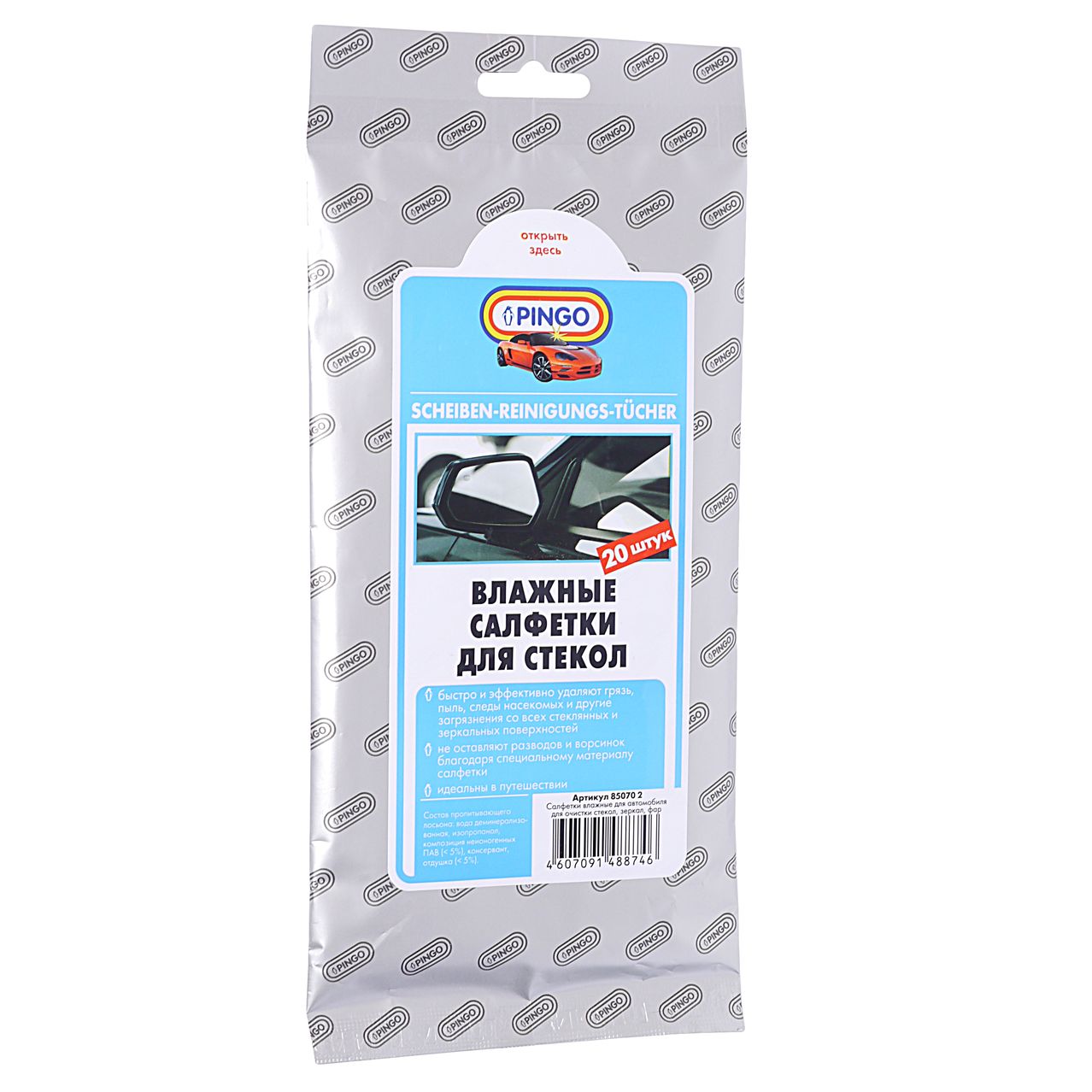 Салфетки влажные для стекол (20х16см) в мягкой упаковке (20шт) PINGO /1/18