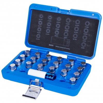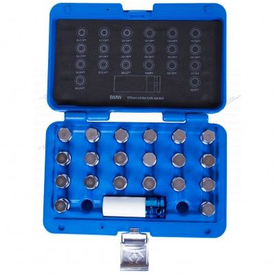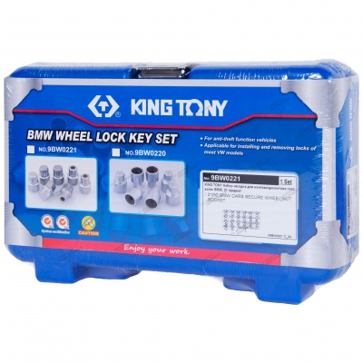 Набор насадок 21 предмет KING TONY 9BW0221 предназначен для монтажа и демонтажа секреток колесных дисков большинства моделей автомобилей BMW.