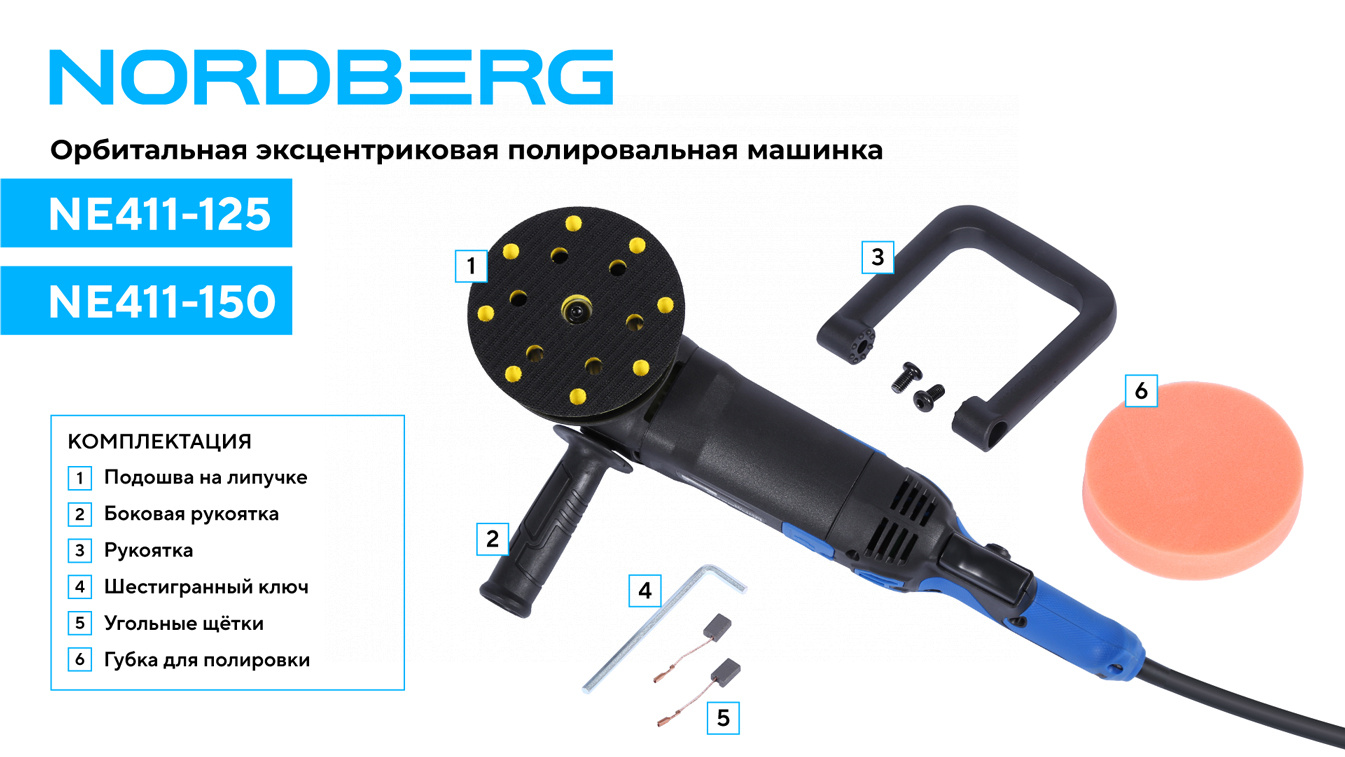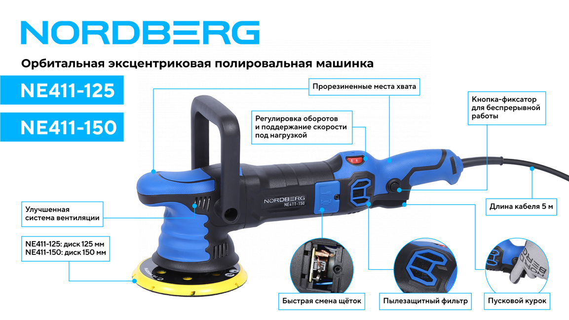 Орбитальная полировальная машинка NORDBERG NE411-150 – электрический инструмент для выполнения профессиональных работ в автосервисах, студиях детейлинга и других предприятиях, занимающихся покраской.