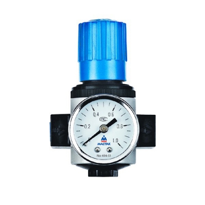 Манометр регулятор 3/8″ МАСТАК 694-31 предназначен для регулировки номинального давления на выходе пневматической линии, необходимого для нормальной работы инструментов и оборудования. Механизм редуктора встроен в блок фильтра.