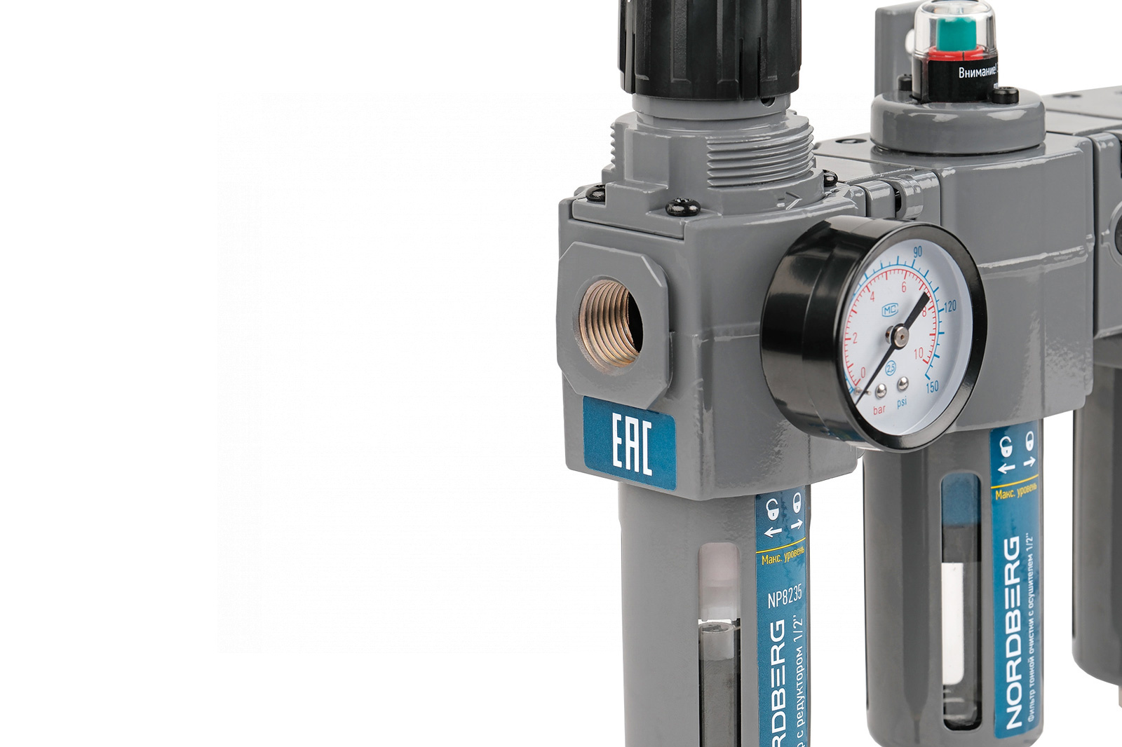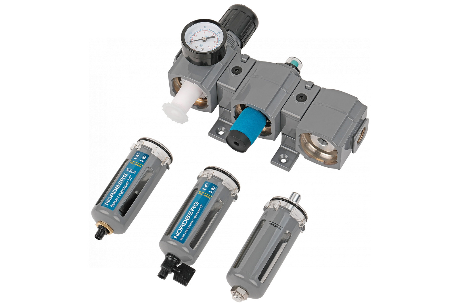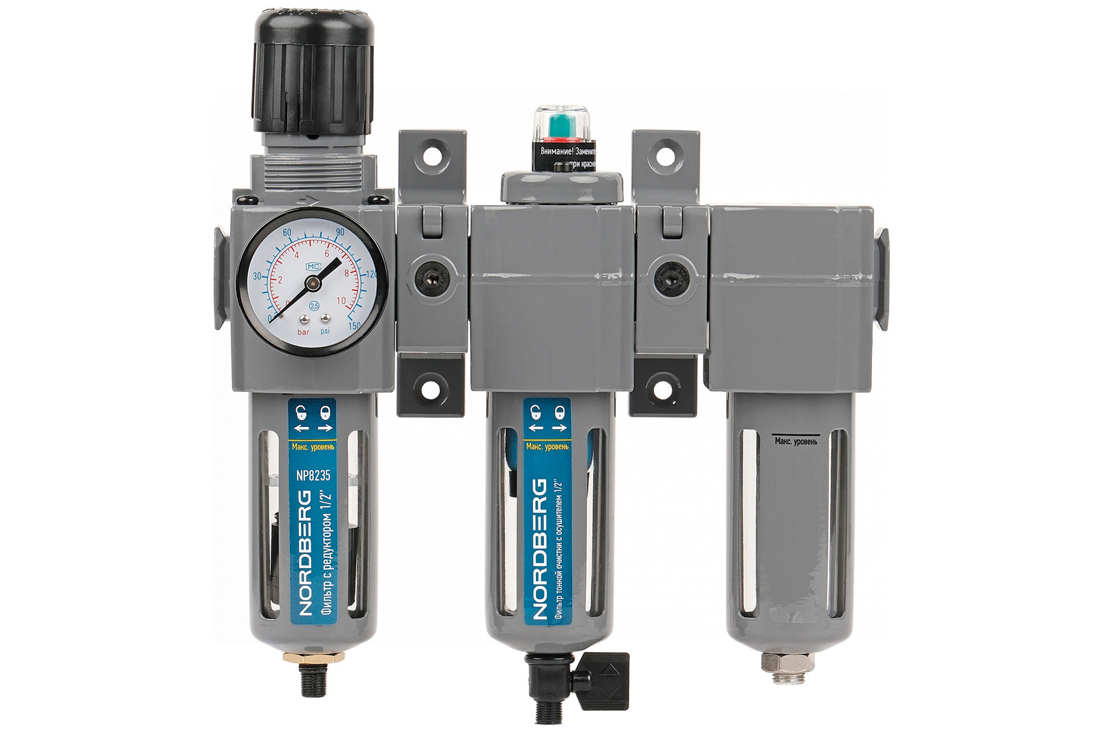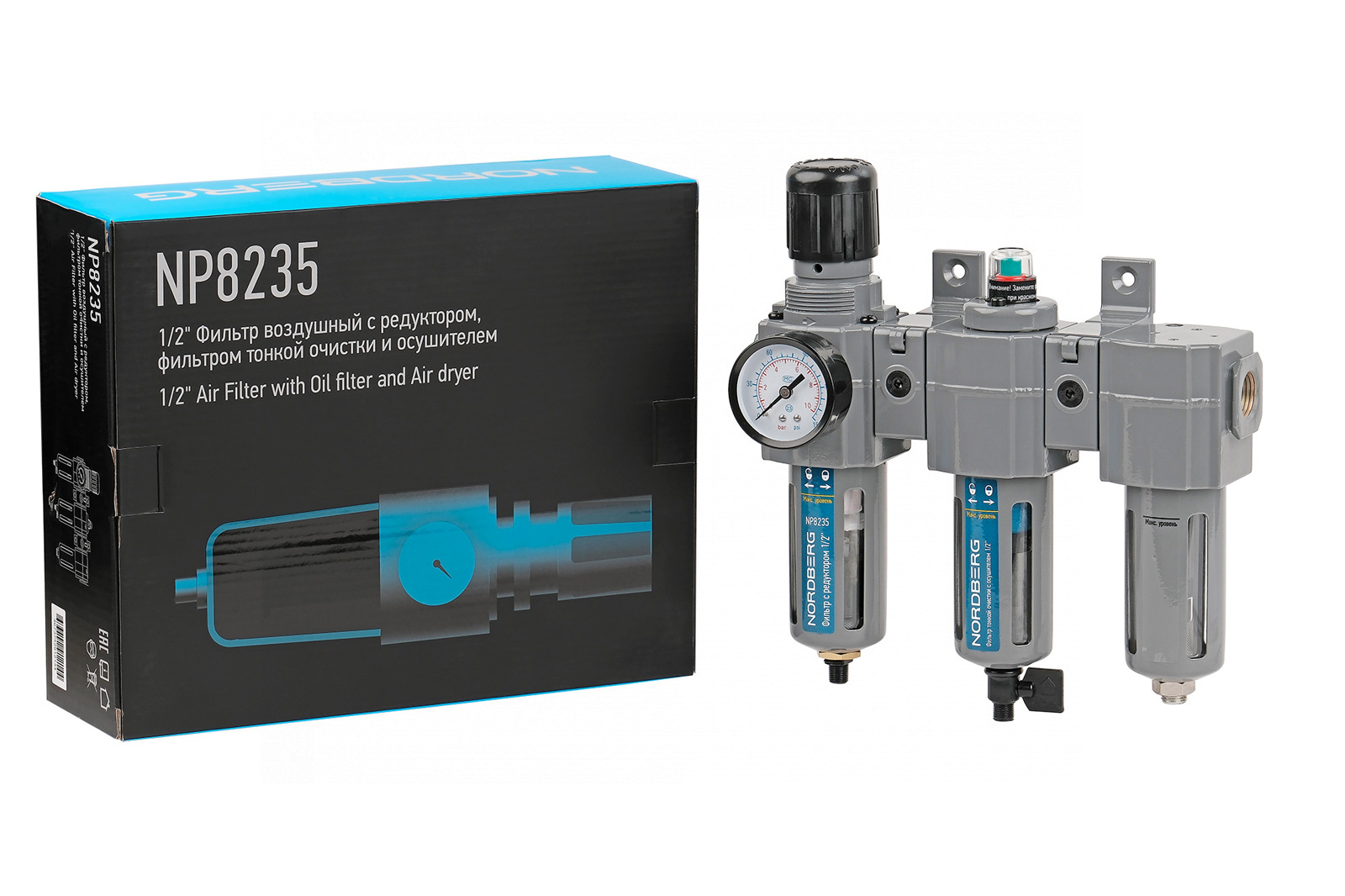 Фильтр воздушный с редуктором (5µm) + фильтр тонкой очистки (0,01µm) + осушитель 1/2″ NORDBERG NP8235