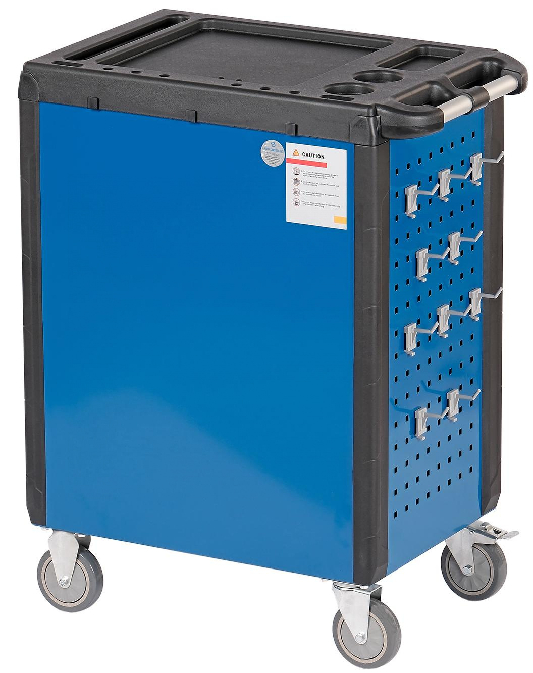 - Одна из боковых стенок тележки имеет перфорированную панель для крепления на ней крючков для инструмента. Крючки идут в комплекте с тележкой.