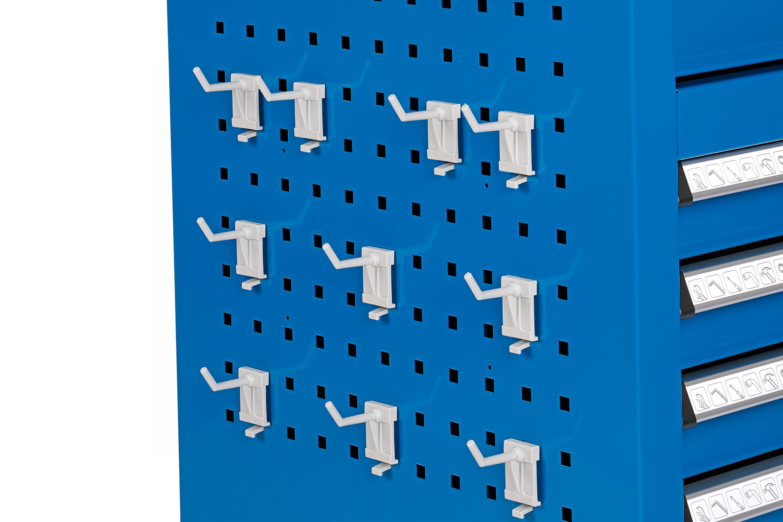 - Пегборд на боковых панелях тележки, оборудованный 10 съёмными кронштейнами с крючками, имеющими двухточечную систему крепления к панели