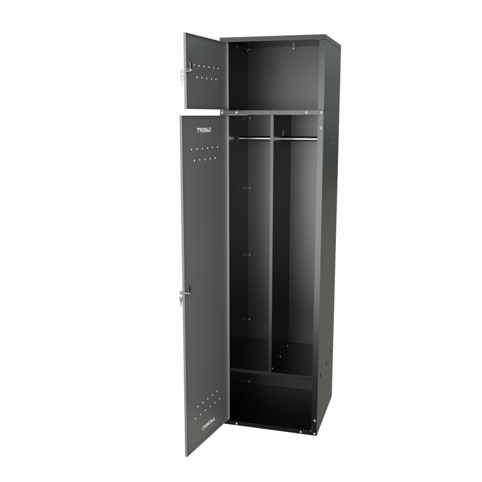 Шкаф для раздевалок GT205SHP.GREY (500мм х 500мм х 1936мм) СЕРЫЙ . Секция для обуви, двойная секция для курток с перекладиной под вешалки, верхняя антресоль с отдельным замком для головных уборов и сумок. Габариты упаковки 1630*540*155 мм (Д*Ш*В)