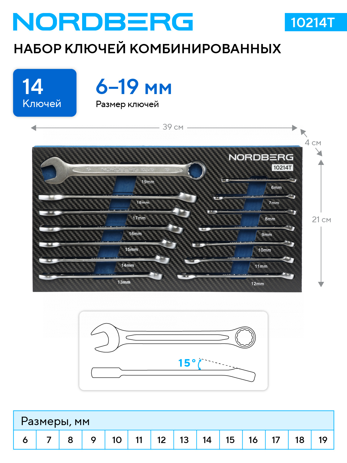 - В наборе 14 ключей размерами от 6 до 19 мм.