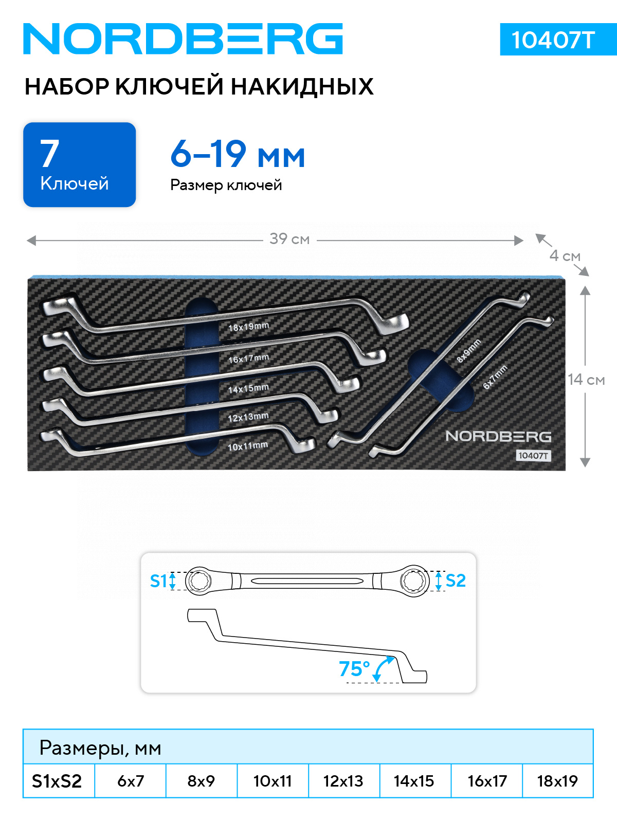 NORDBERG 10407T — Набор ключей накидных в ложементе для тележки, 7 шт.