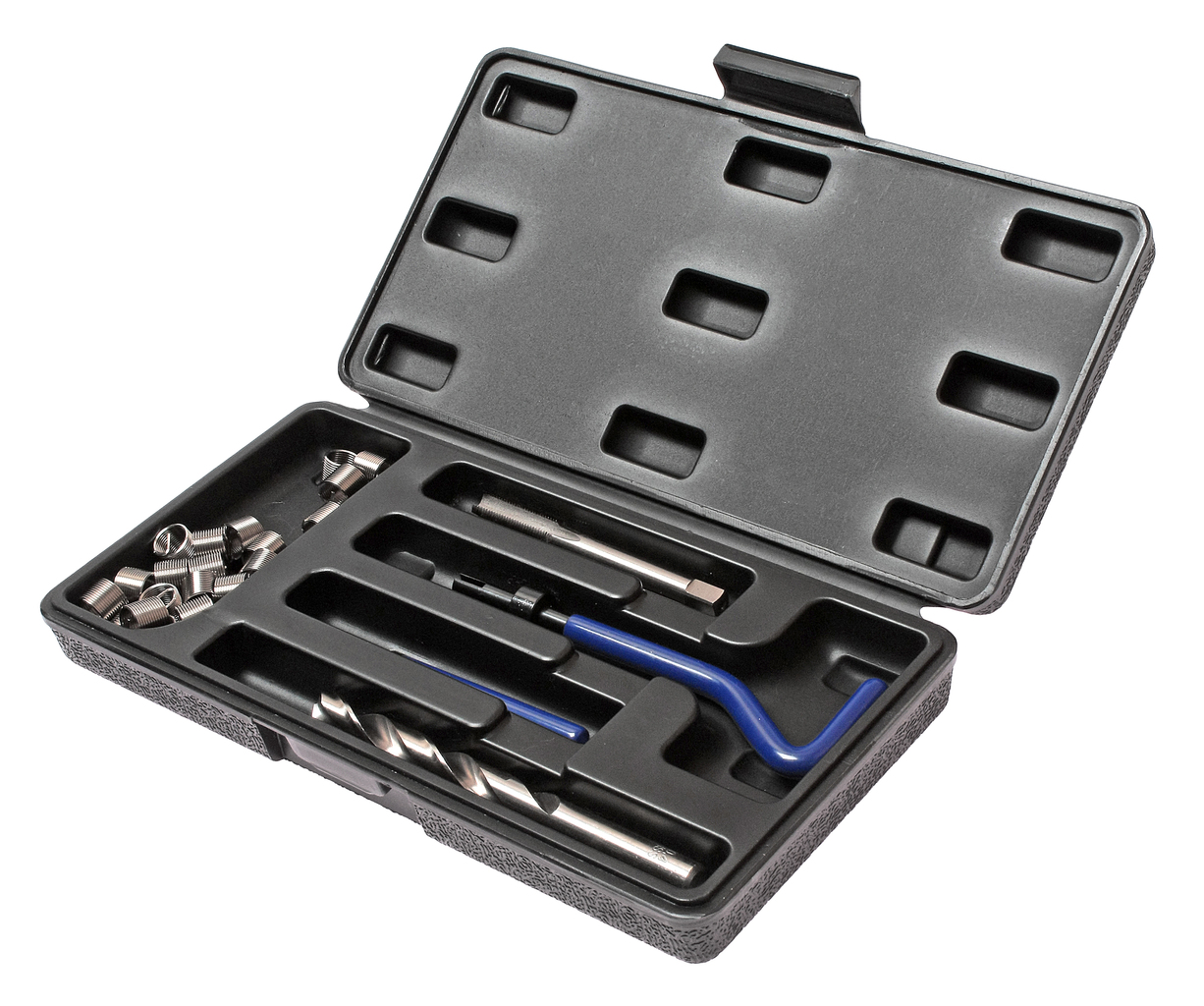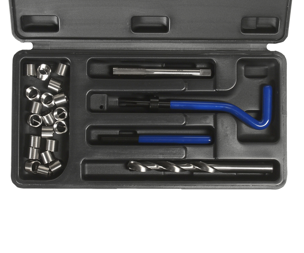 В комплект входят: сверло, метчик, установочный инструмент, инструмент для обламывания хвостовика, резьбовые вставки