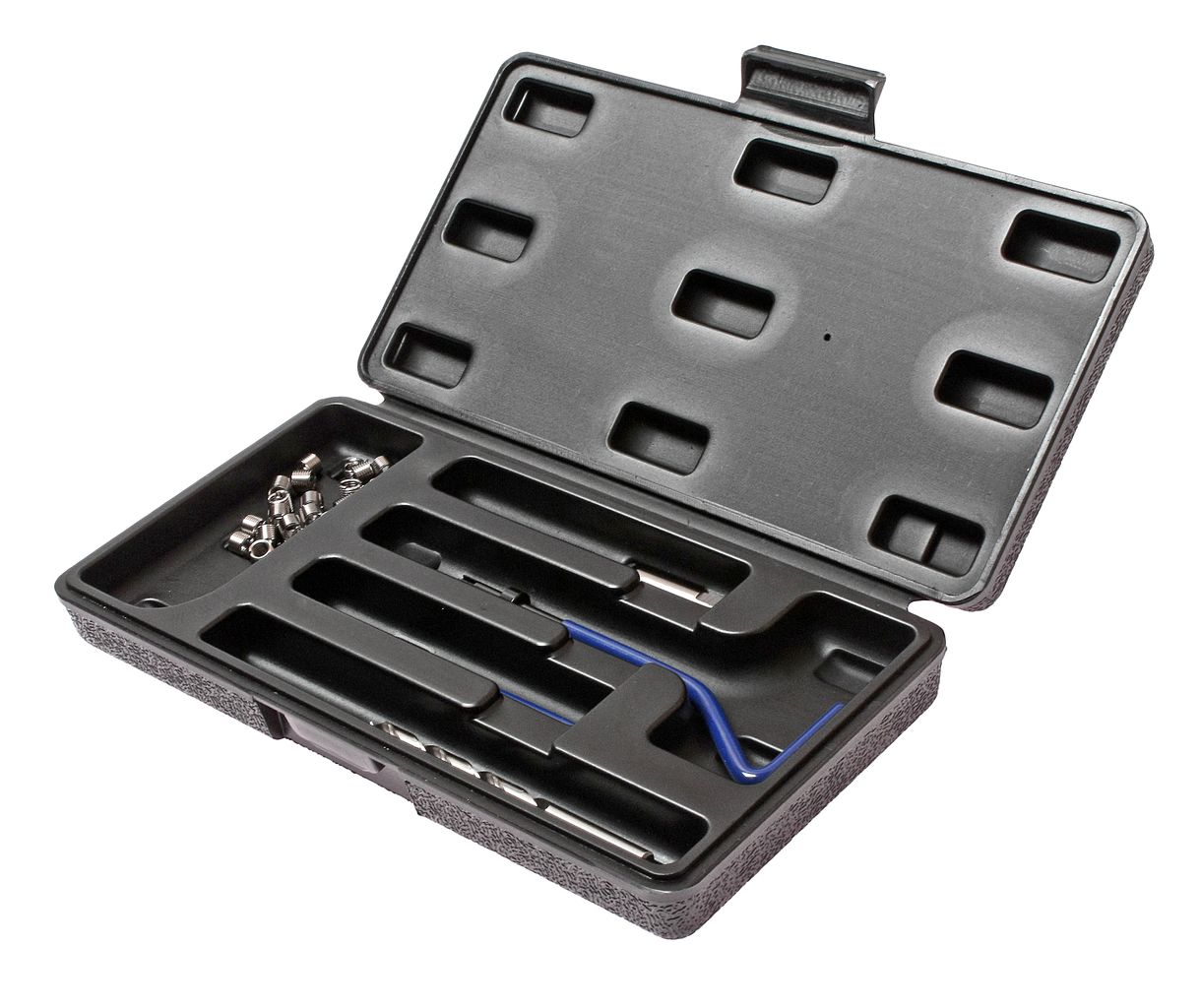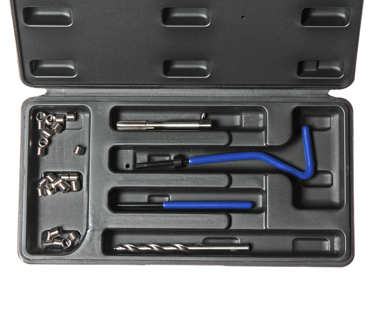В комплект входят: сверло, метчик, установочный инструмент, инструмент для обламывания хвостовика, резьбовые вставки.
