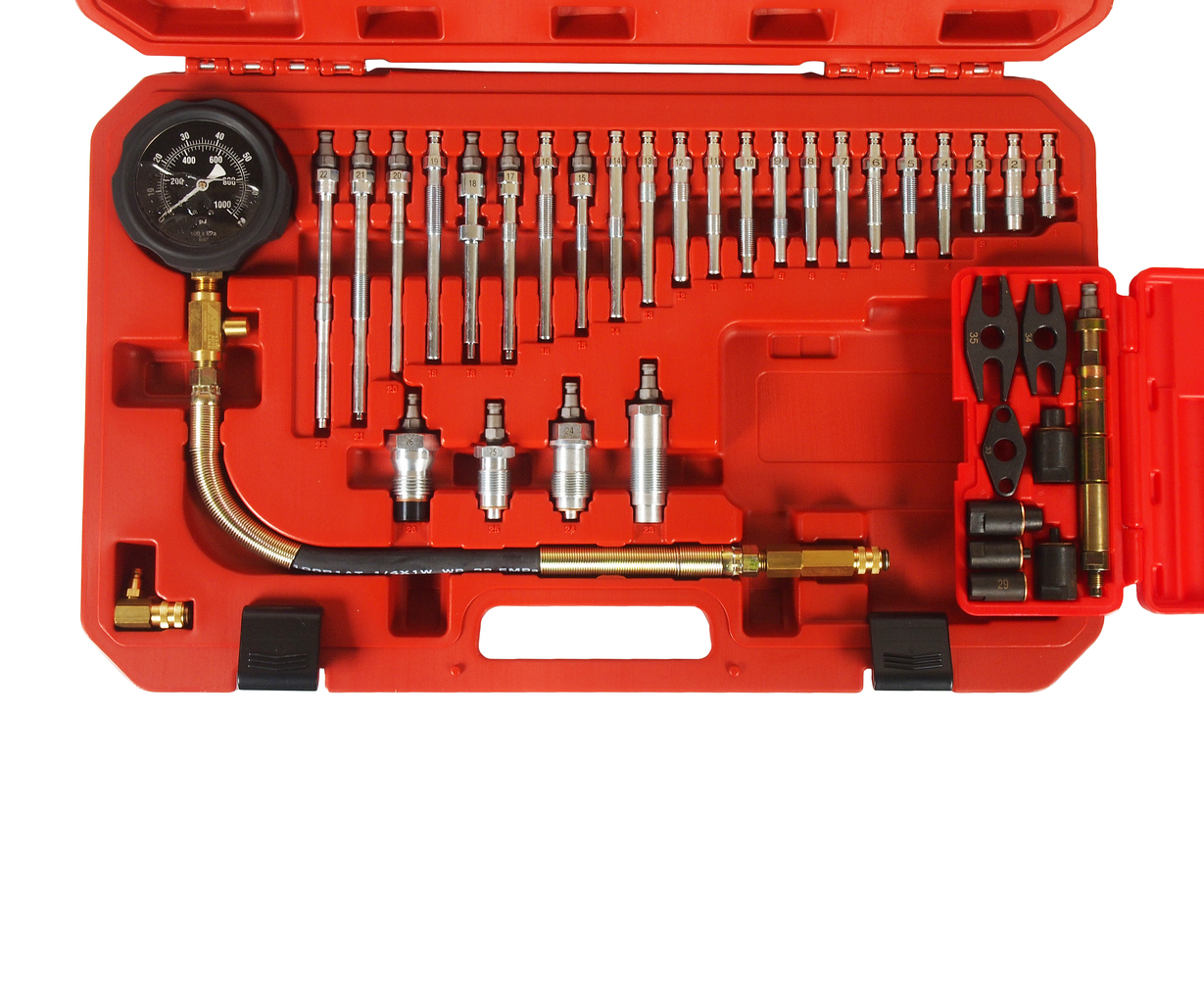 В комплект входит высокоточный манометр в прорезиненном кожухе, а также специальные переходники для форсунок и свечей накаливания.
